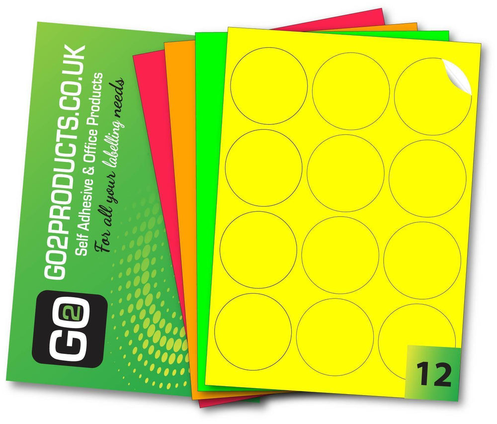 Round Fluorescent Adhesive Printer Labels (64mm Diameter) – 12 labels per sheet with a strong permanent adhesive. Available in Fluorescent Yellow, Fluorescent Green, Fluorescent Pink, or Fluorescent Orange, these bright, high-visibility labels are perfect for inkjet & laser printers, photocopiers, or handwriting.